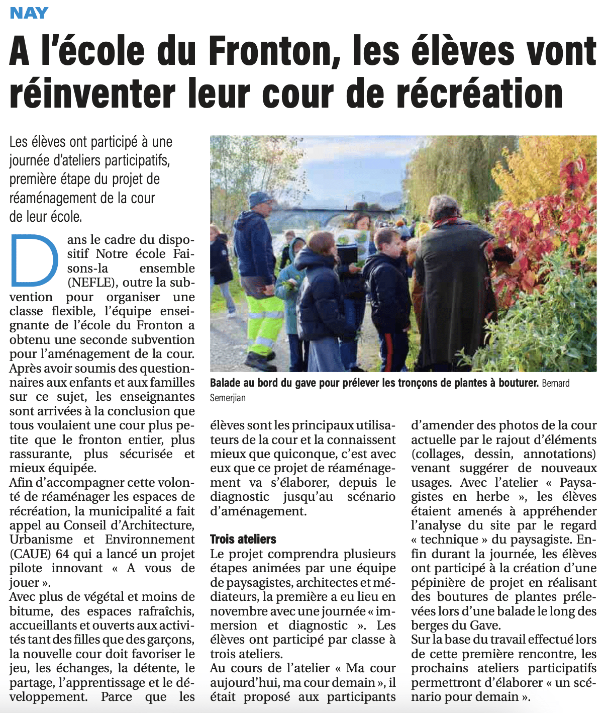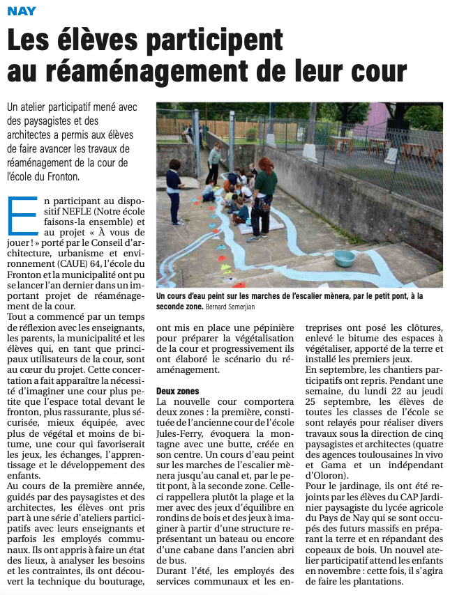 - « Nay. Les élèves participent au réaménagement de leur cour », La République des Pyrénées, 30/09/25