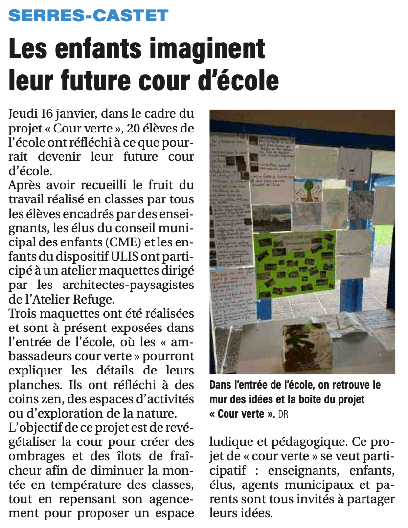 - « Serres-Castet. Les enfants imaginent leur future cour d’école », La République des Pyrénées, 31/01/25