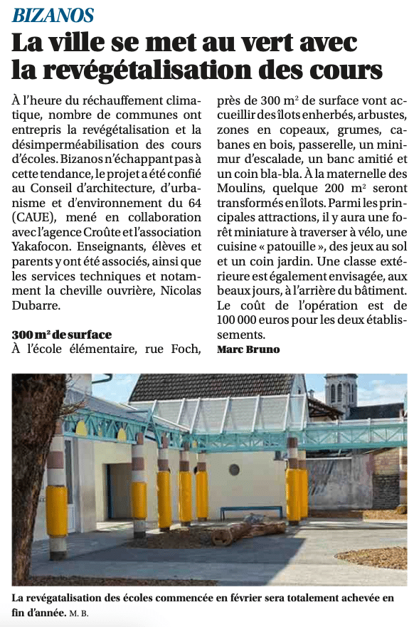 - « Bizanos. Métamorphose écologique et éducative dans les cours d’écoles », La République des Pyrénées, 19/11/25