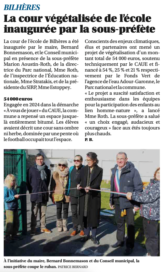 - « Bilhères-en-Ossau. La cour végétalisée de l’école inaugurée par la sous-préfète », Sud-Ouest, 25/11/25