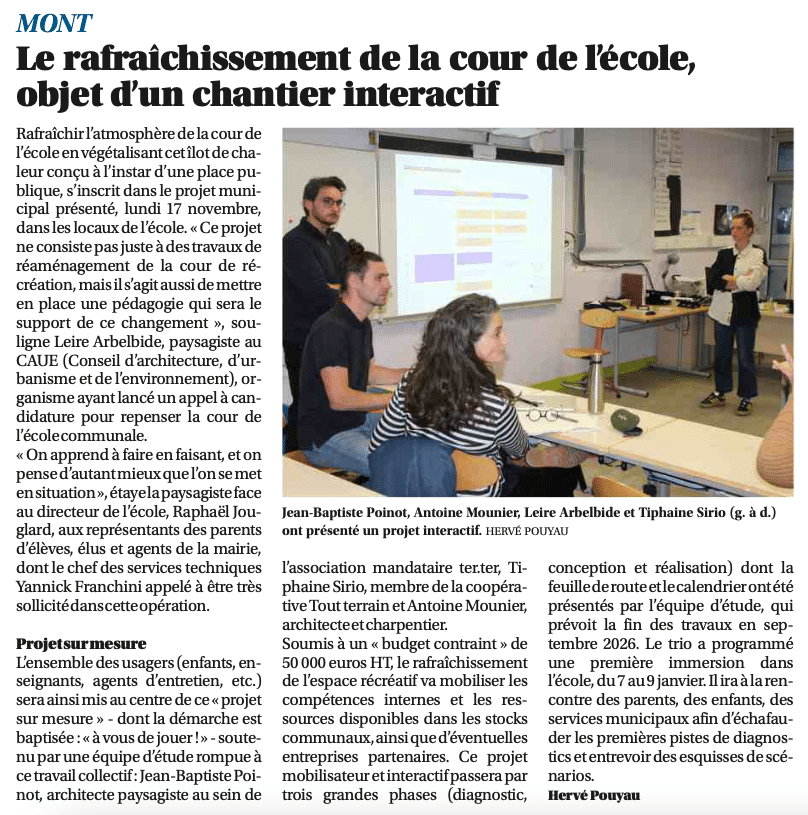 - « Mont. Le rafraîchissement de la cour d’école, objet d’un chantier interactif », Sud-Ouest, 26/11/25