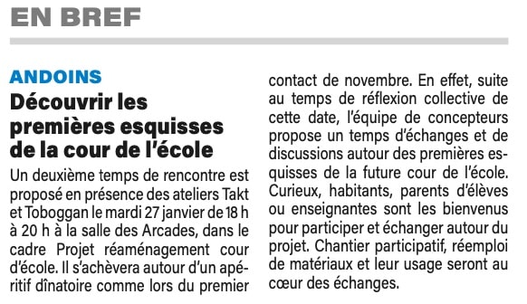 - « Andoins. Découvrir les premières esquisses de la cour d’école », La République des Pyrénées, 21/01/26